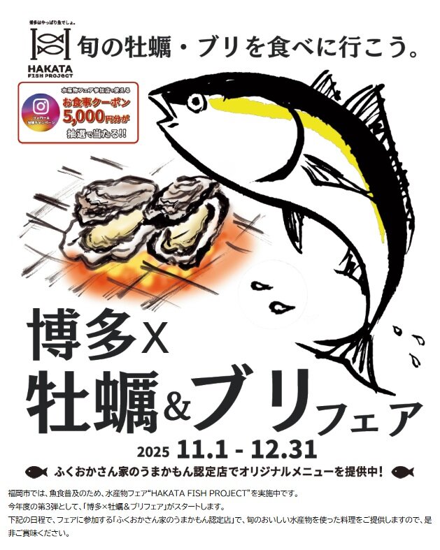 現在「博多×牡蠣&ブリフェア」が行われており、フェアに参加する「ふくおかさん家のうまかもん認定店」で、旬のおいしい水産物を使った料理が提供されています。詳しくは以下のホームページをご覧ください。
