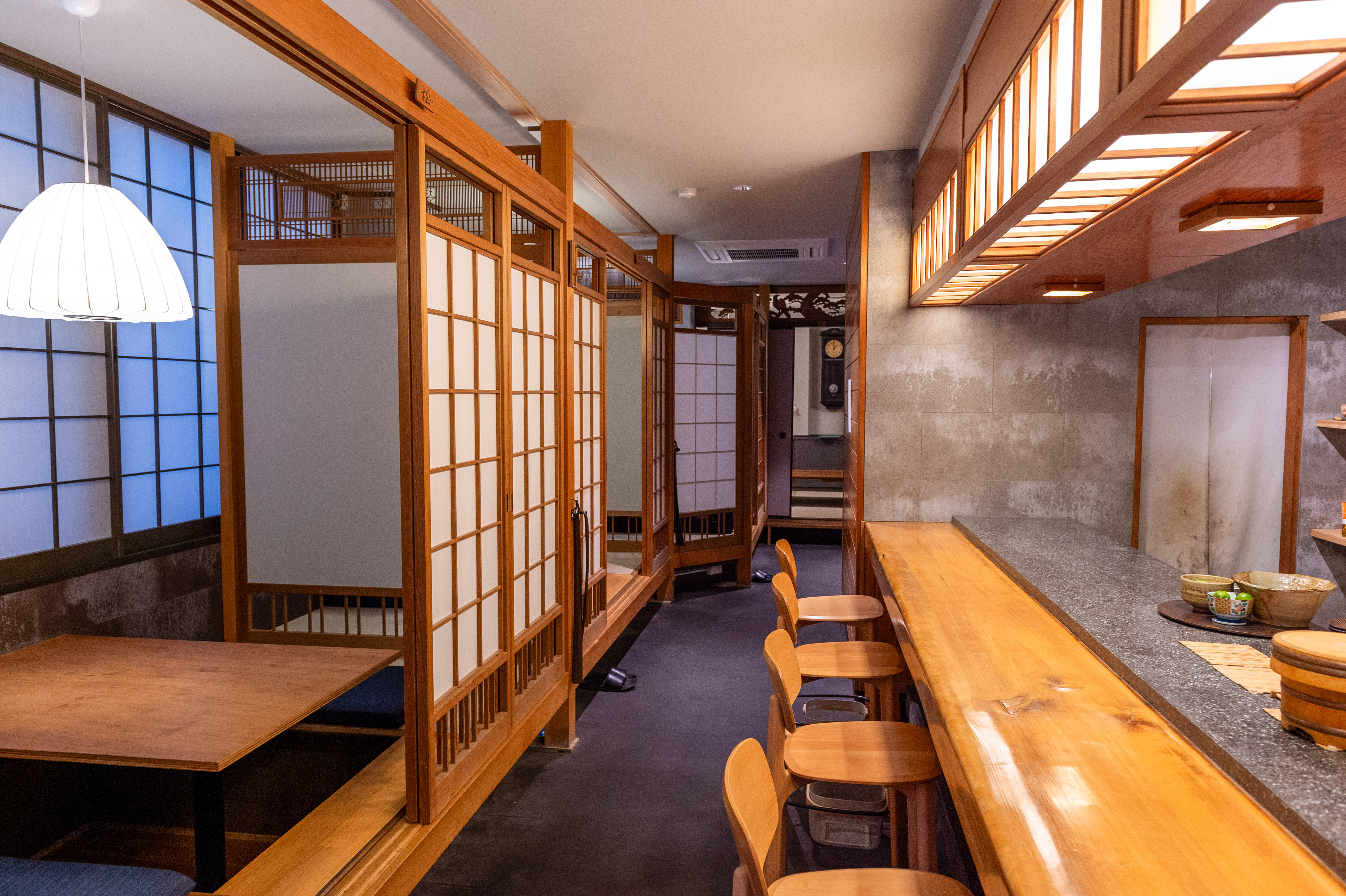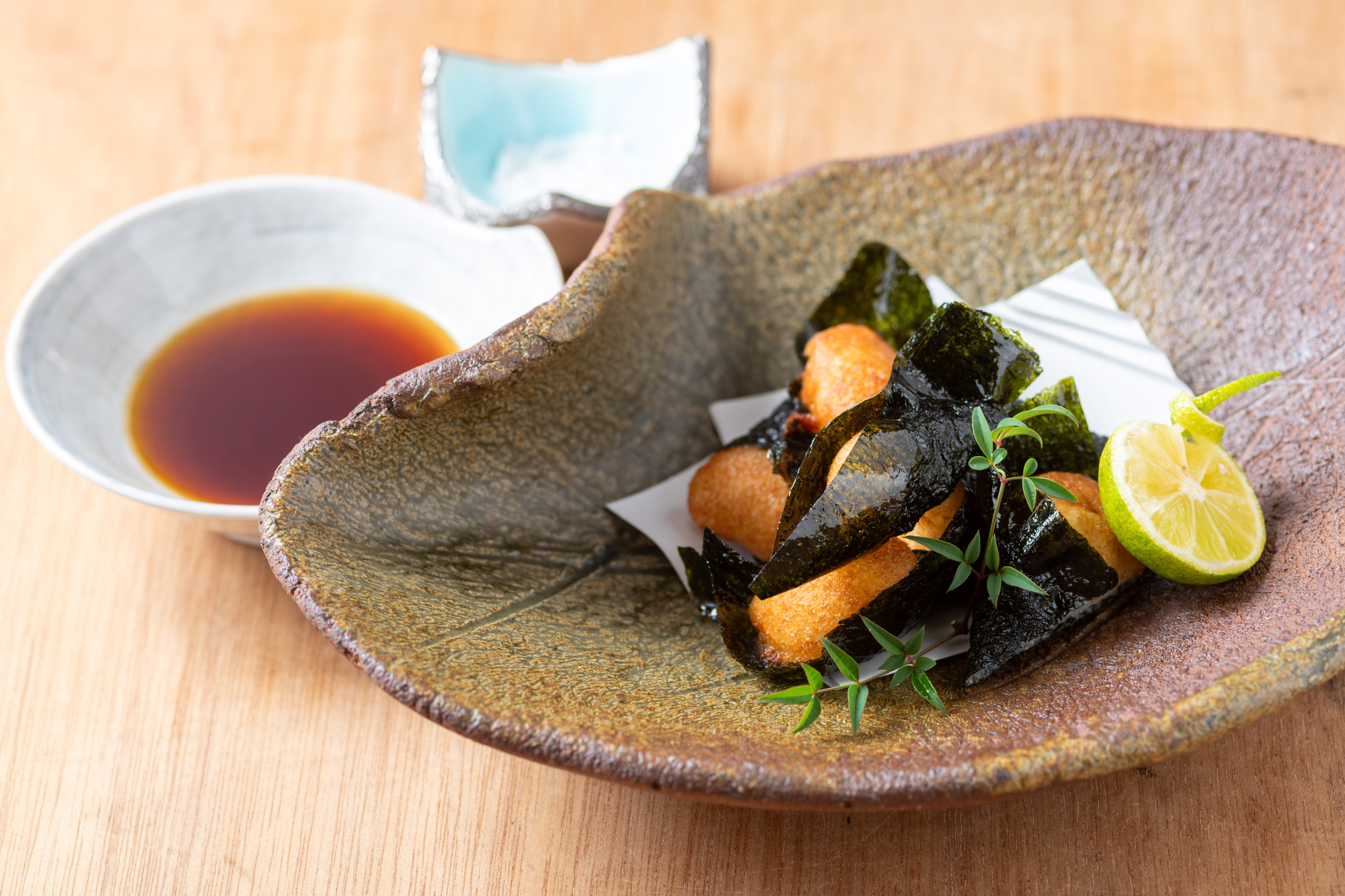 有明海をはじめ全国各地の魚介類をメインにしたワンランク上の居酒屋。「握り寿司」や「刺身」は熟成された魚が持つ深い味わいと風味を存分に楽しむことができる店主こだわりの逸品。福岡有明のりフェアでは、強い粘りとコクのある旨味が特徴の大和芋をすりおろし、『福岡有明のり』で包んで揚げる『大和芋磯辺揚げ』が登場。外はサクサク、パリパリ、中はふんわりの食感がクセになる。塩と天つゆが添えられるのでお好みで召し上がれ。山と海の幸が奏でる芳醇な風味は、幅広く揃った地酒との相性もよし。