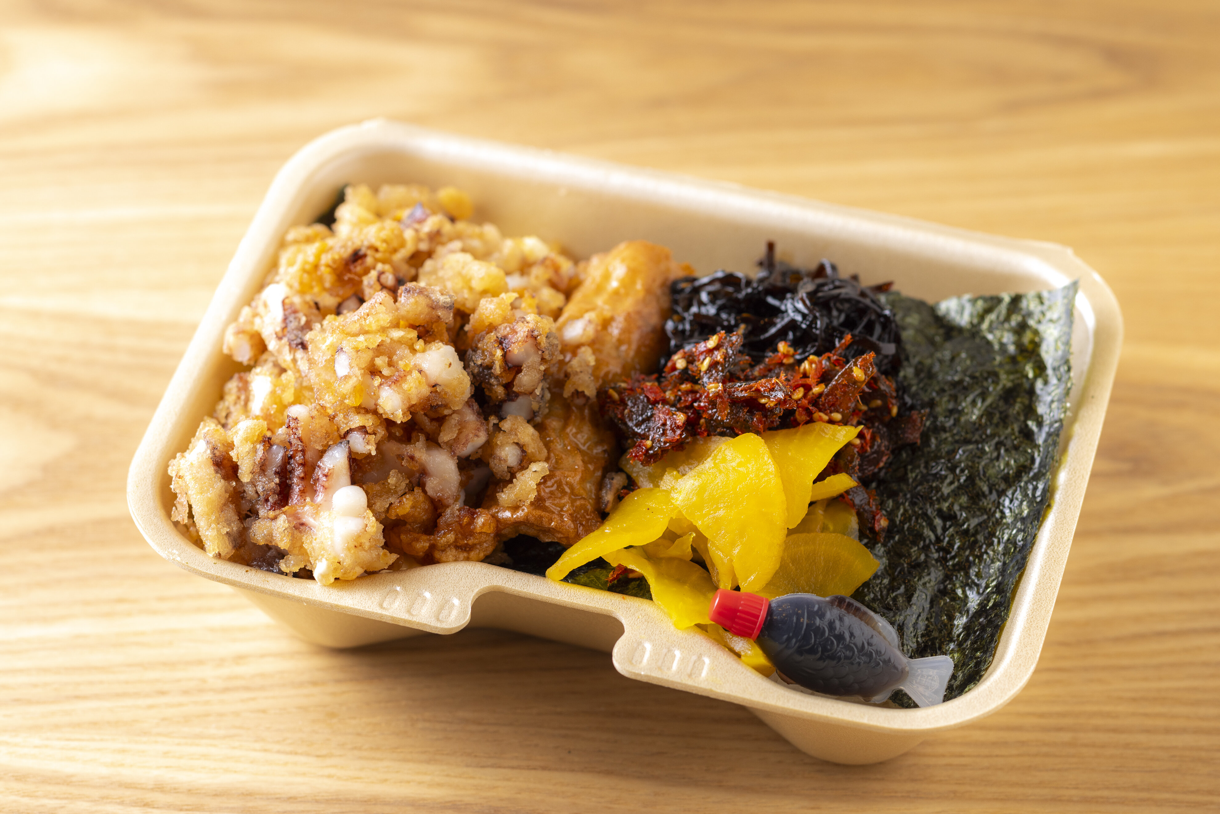 大牟田名物『イカタル弁当』は、石井征子さんが切り盛りした大牟田の老舗弁当店『マイキッチン』のヒット商品。その後『マイキッチン』は惜しまれつつ閉店したが、今は娘の良子さんがその味を受け継ぎ、母が築いた弁当の味を『カントリーキッチン』の味として守り続けている。色艶の良い『福岡有明のり』の下に、ふっくらと炊きあげた国産米。海苔の上にはタルタルソースと香ばしく揚がったイカゲソ。庶民派でありながらも、ふわっと香る海苔の風味は上質。パリッと箸切れも良く、本物の海苔の美味しさにこだわった逸品だ。