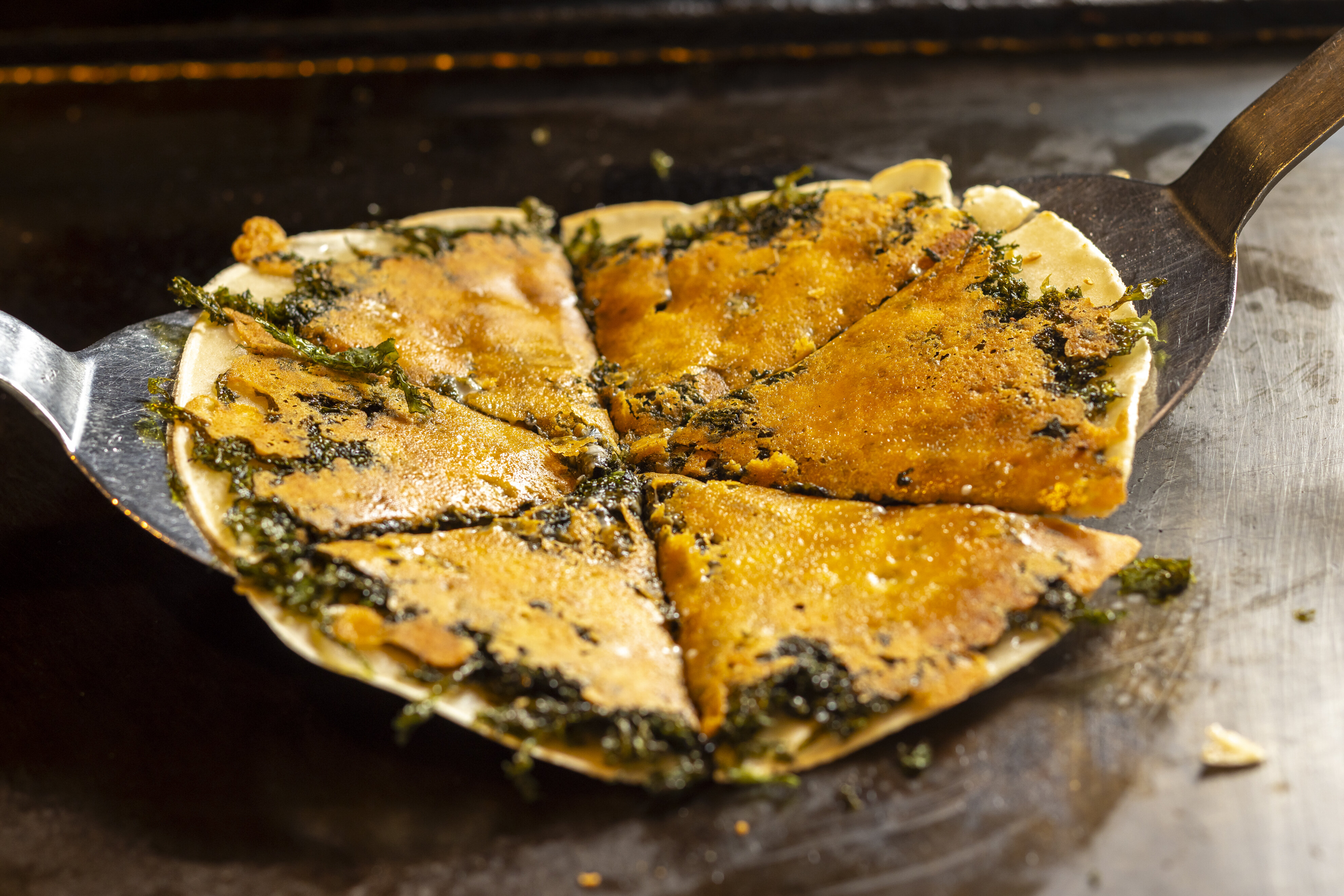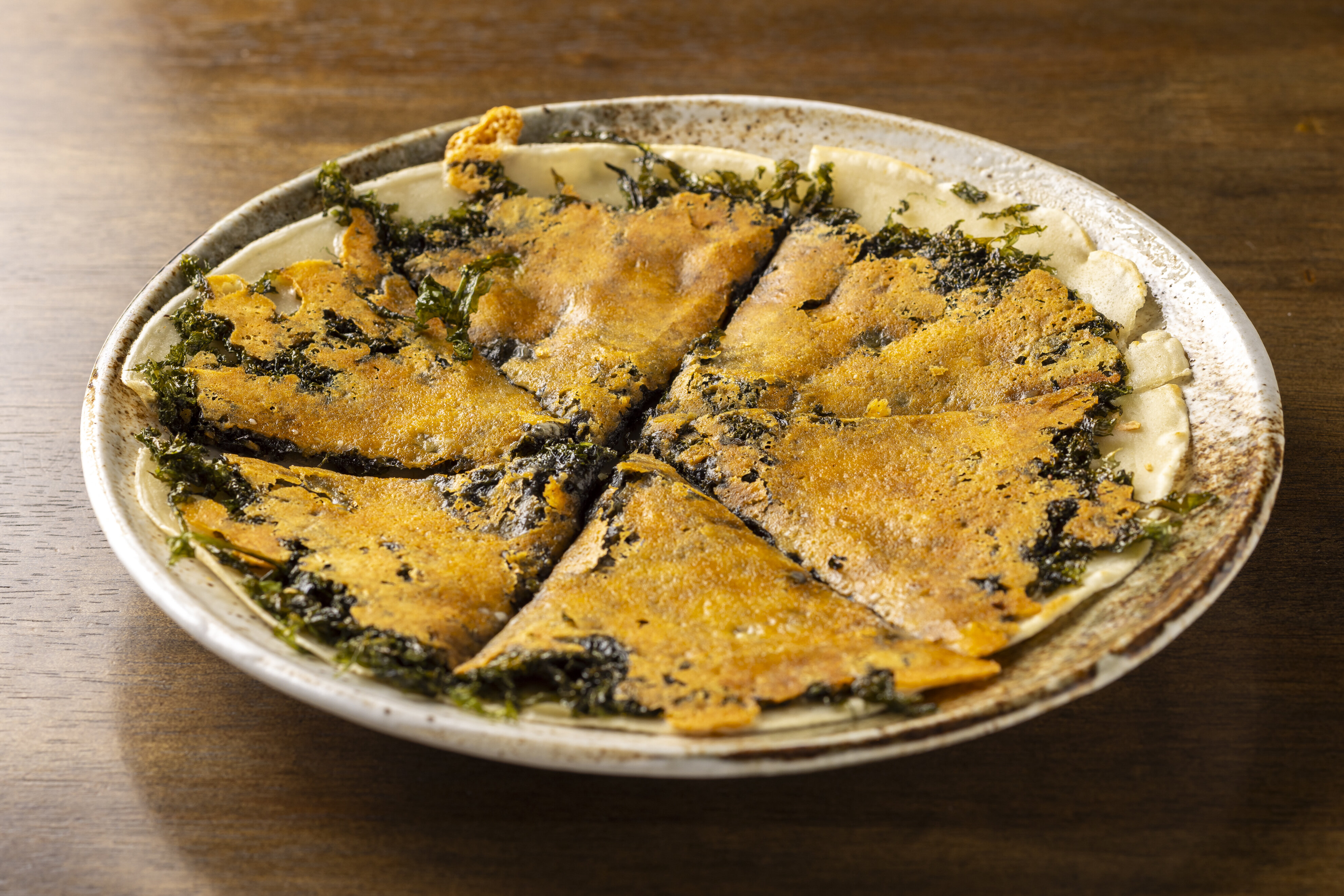 柳川駅前にある鉄板ダイニング。『海苔とチーズのねぎ焼き』は、関西では定番のねぎ焼きをヒントに、『福岡有明のり』を合わせたオリジナルメニュー。「地元の食材を使って、鉄板焼き屋らしいメニューを作りたい」と、2020年に提供したところ人気となり、今や店の定番メニューに。海苔本来の味が楽しめるバラ干し海苔に、魚粉の風味、チーズのコクがマッチする。