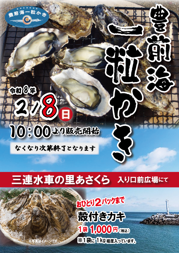 令和8年2月8日(日)に三連水車の里あさくらにて「豊前海一粒かき」の販売促進イベントが開催されます。