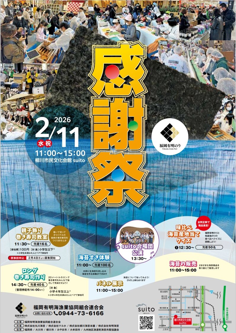 2月11日(水・祝)、柳川市民文化会館にて、福岡が誇るブランドのり「福岡有明のり」を見て・作って・食べて楽しめる"福岡有明のり感謝祭"が開催されます!