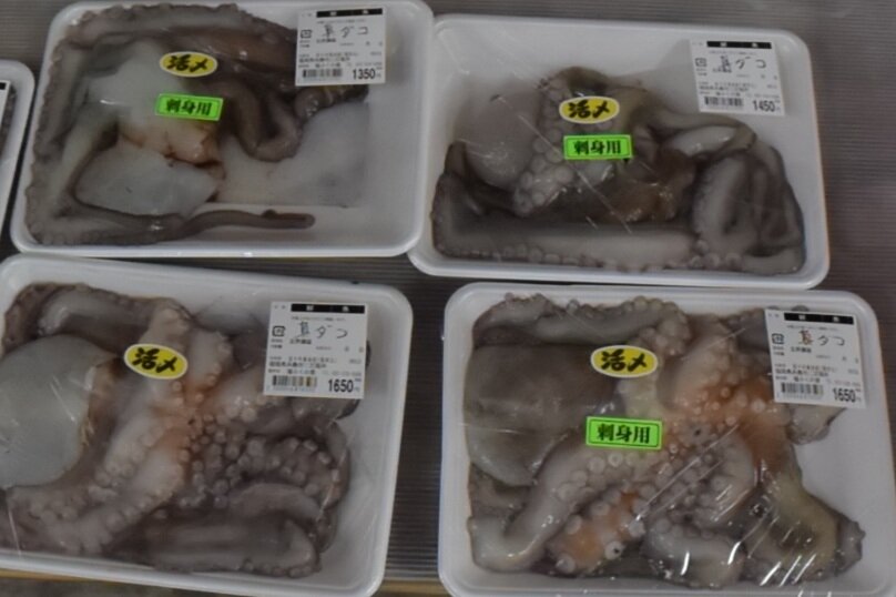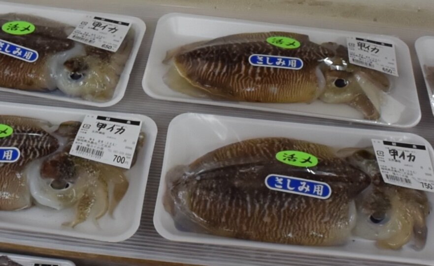 売り場をのぞくと、まず、目に入ったのはたくさんの「コウイカ」と「マダコ」!!「なんか~、タコやイカって調理が難しいのでは?」と思ってるかもしれませんが、実はそうでもないんですよ。是非お店のスタッフに聞いてみてくださいね。