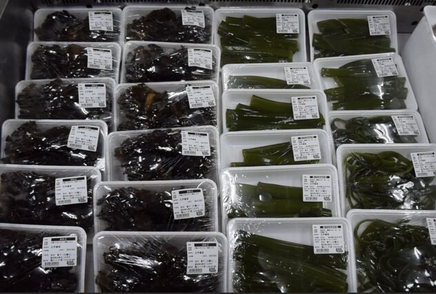 いつのまにか、ワカメの季節。ワカメもたくさん並んでました。湯通し前のワカメ(褐色)、湯通し後のワカメ(緑色)。皆さんがよく食べてる「葉」の部分だけでなく、「茎」や「メカブ」なども。また、「テングダイ」に「オニオコゼ」。調理済みの「アカエイ」、それに「ナマコ」も並んでいましたよ。